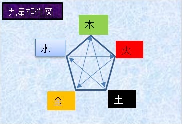 例えば、金星(六白金星、七赤金星)の場合、自分自身の星と、両脇に居る土星(二黒土星、五黄土星、八白土星)と水星(一白水星)とは相性が良いのですが、対角線上にいる木星(三碧木星、四緑木星)と火星(九紫火星)とは相性が良くありません。